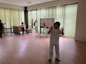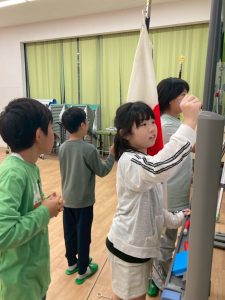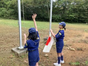 立派な国旗ポールがあるのでくまスカウトは国旗掲揚の訓練。