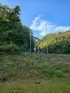 立派な国旗ポールがあるのでくまスカウトは国旗掲揚の訓練。