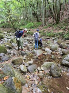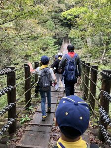 沢を歩いて吊り橋をわたって滝を横目にすすめすすめ。